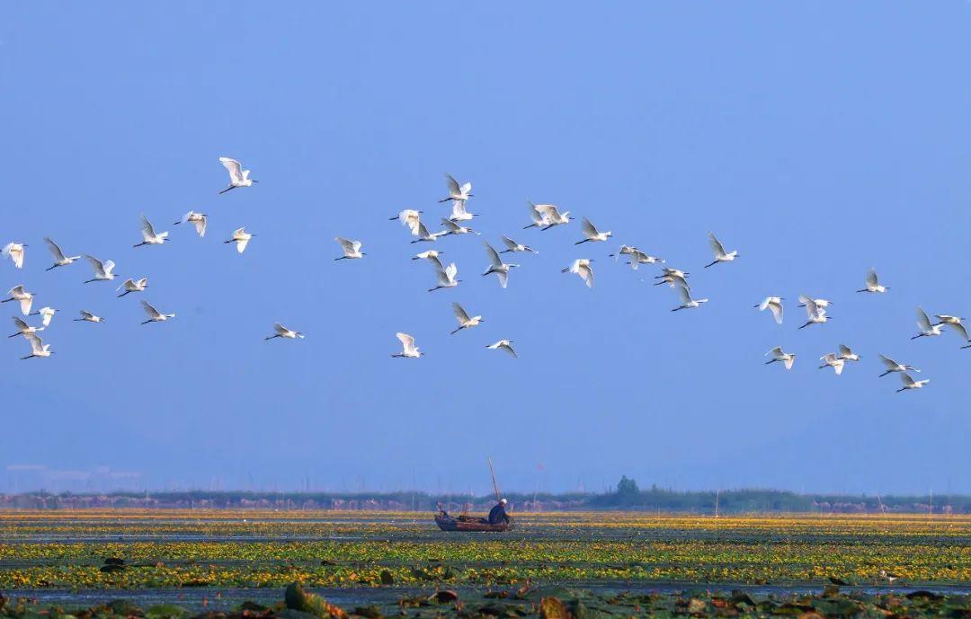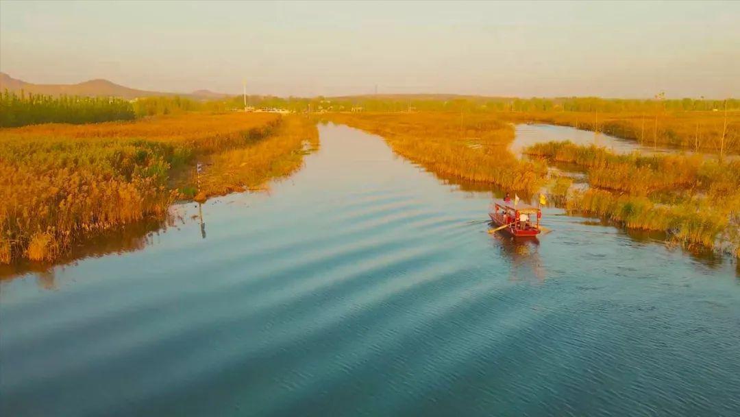 在东平湖湿地公园乘一艘小船,穿梭在湖中的芦苇迷宫里,看着船身拨开身边的水波,静谧的空间只有水声流动的声音。