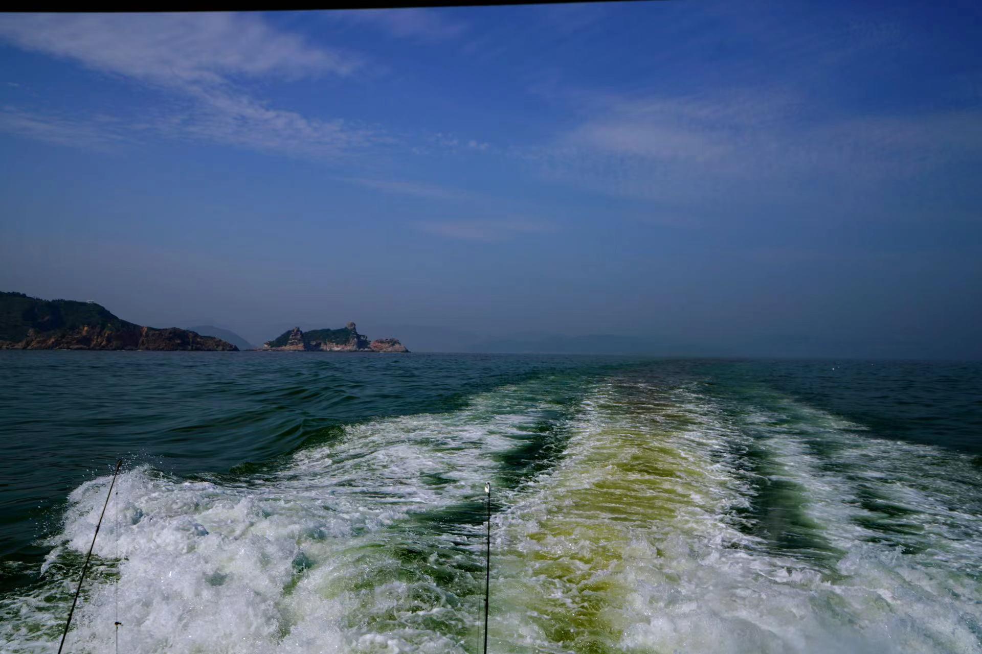 午后,我们坐着游艇,想到金元宝岛走走的,据说那里有一块红色的礁石,很美。而我们靠近金元宝岛时,被告知没有小船接应,带着些许遗憾,我们折回去。