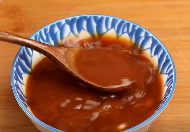 2.下面调一个料汁,碗中加一勺生抽、半勺老抽和半勺素蚝油、适量的食盐和白糖、一勺玉米淀粉,再加点凉白开,搅拌均匀后备用。