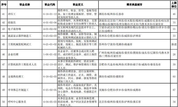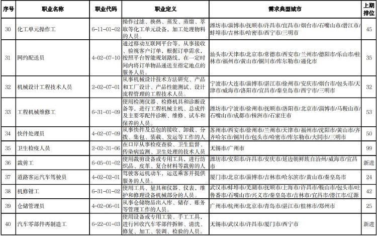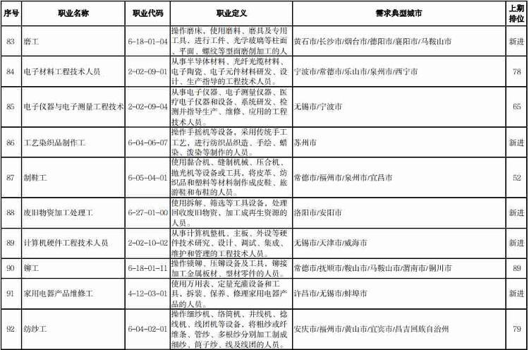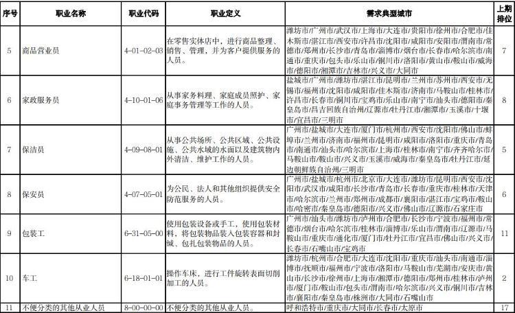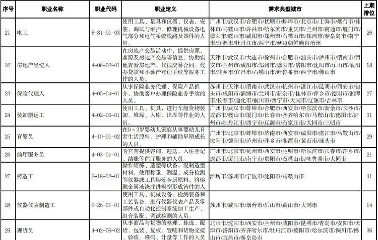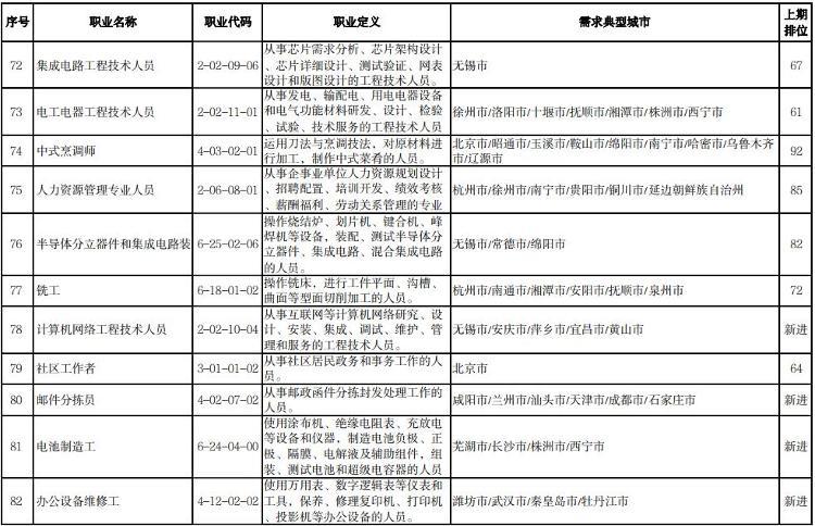 人社部介绍,本期数据构成据由“序号”“职业名称”“职业代码”“职业定义”“需求典型城市”“上期排位”六个部分组成。“职业名称”“职业代码”“职业定义”适用中华人民共和国职业分类大典的职业分类标准。“需求典型城市”是指填报该职业需求的典型城市名单,排在前面的城市需求缺口大于排在后面的城市。“上期排位”表示上期(2022年第三季度)该职业的排位情况。